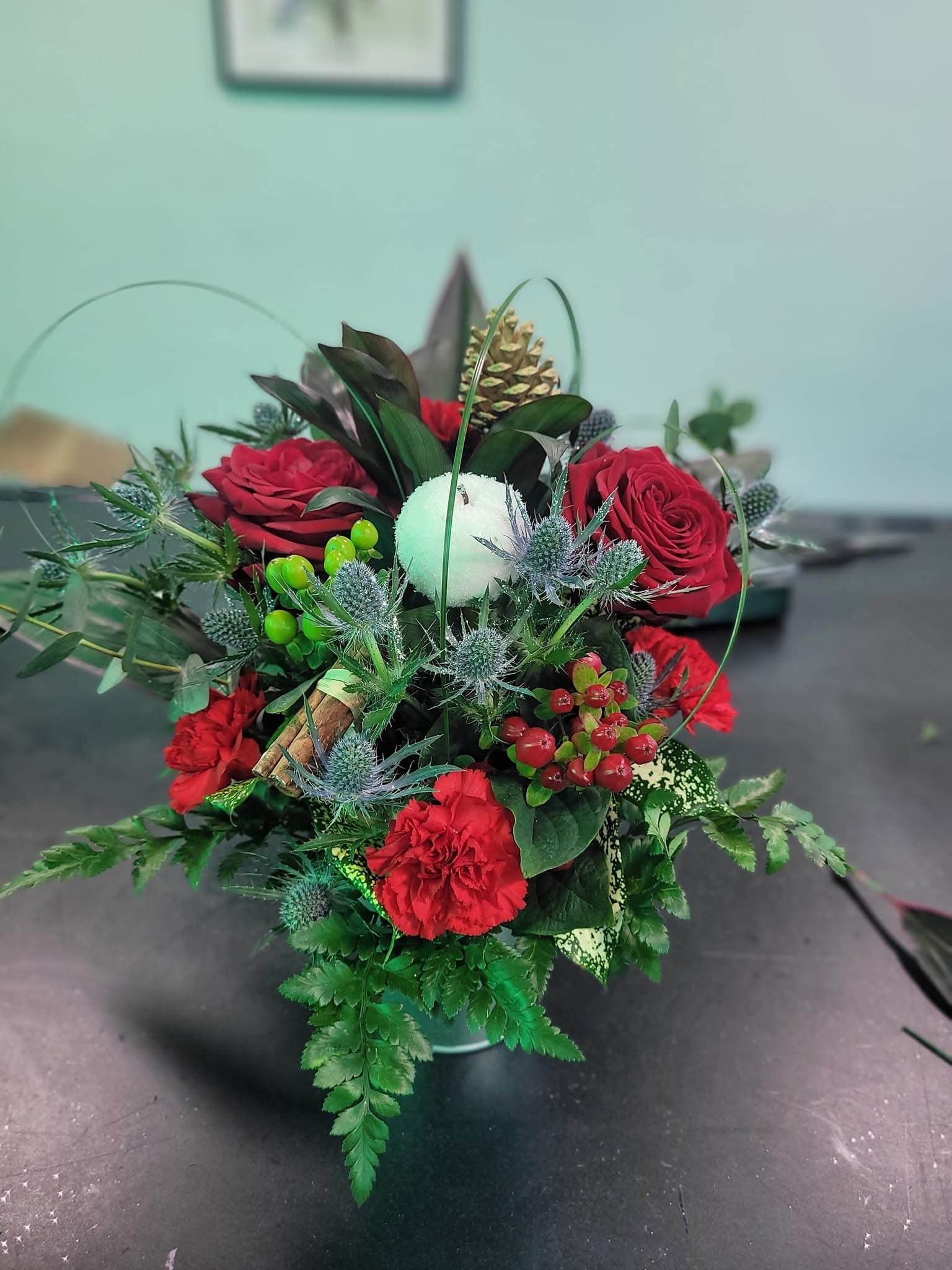 A beautiful festive arrangement, available in a variety of colour schemes. This arrangement comes in its own pot with floral oasis. This allows you to remove blooms once spent and even add more.